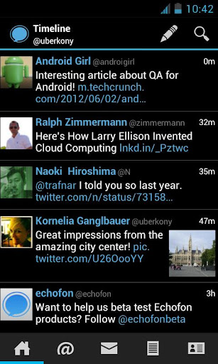 Yang unik dari Echofon, Anda dapat memasang widget di halaman depan ponsel atau tablet Android. Ini memberi kemudahan agar Anda tak perlu membuka aplikasi untuk melihat update timeline Twitter Anda.